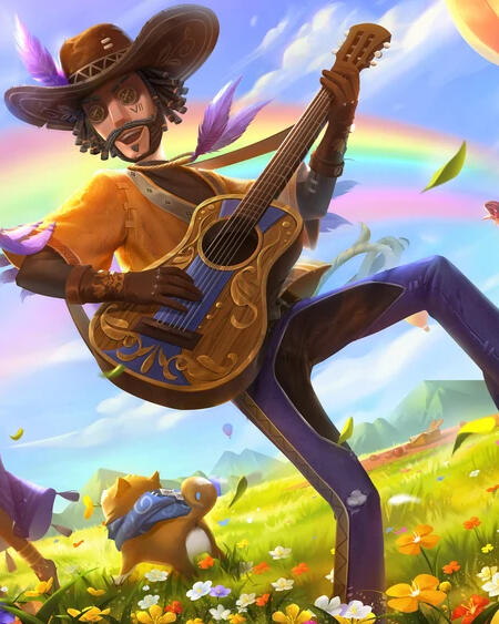 He likes to drink Mezcal, Mexican alcoholic beverage. Mexican Cowboys were dominant at their times as they were called the vaqueros, he has an accessory which is a Mandolin (bandolón ) and in official art he plays guitarróns.